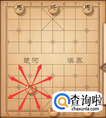 马走动的方法是一直一斜,即先横着或直着走一格,然后再斜着走一个对角线,俗称“马走日”。马一次可走的选择点可以达到四周的八个点,故有“八面威风”之说。如果在要去的方向有别的棋子挡住,马就无法走过去,俗称“蹩马腿”。