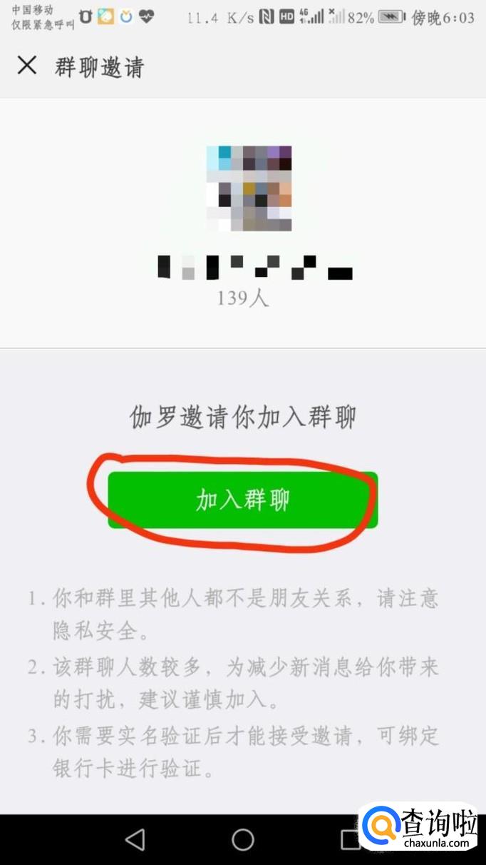 在微信聊天窗口就会出现一个邀请链接,点进去并打开,看到这样的一个界面,点击“进入群聊”即可。