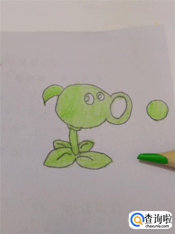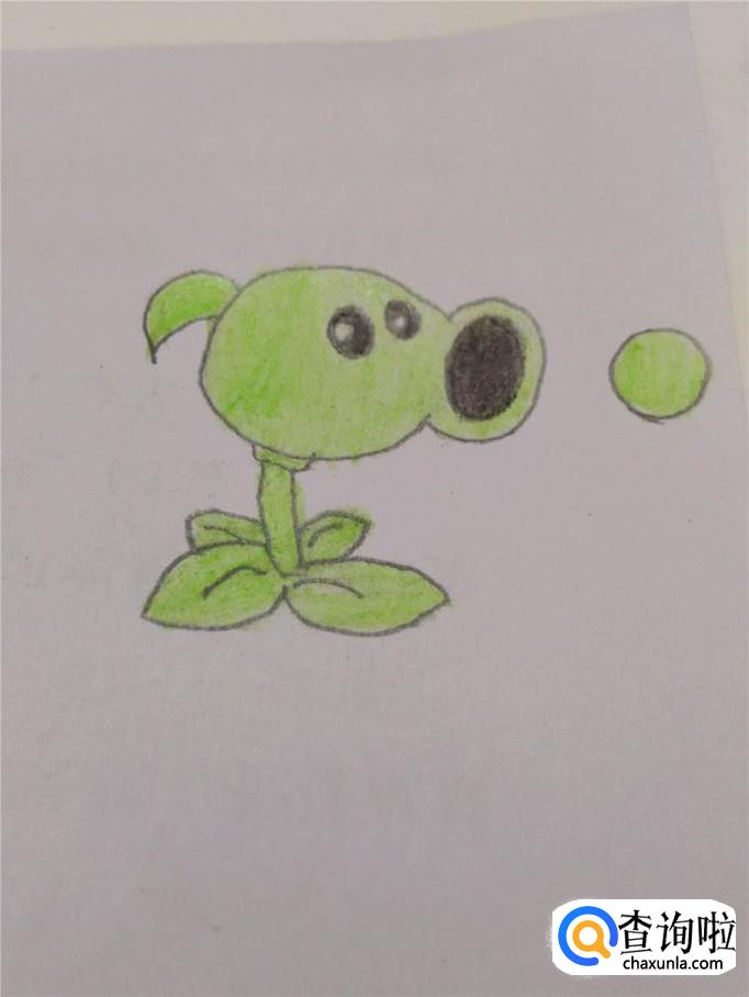 再把眼睛和口腔涂成黑色,但眼里的那个小圆不要涂,那是眼睛里的高光,到这里,豌豆射手就全画完了。