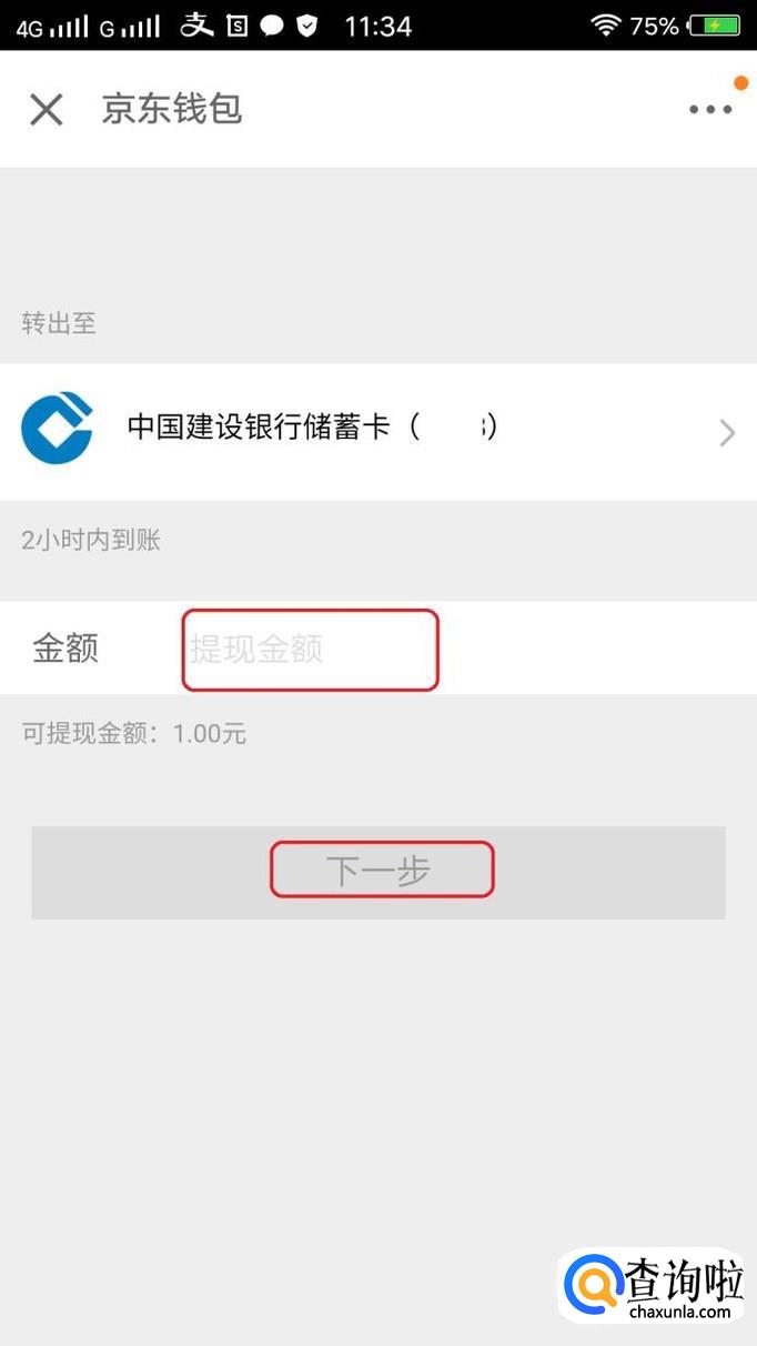 我们点击“提现”,输入金额,点击“下一步”(余额只能提现到你的京东安全卡内,必须是普通的借记卡或者储蓄卡)。