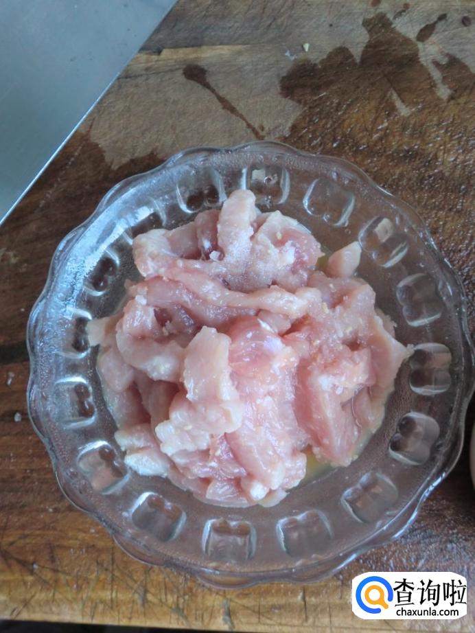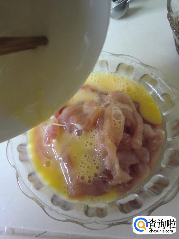 把猪里脊切成长条,然后加入盐,料酒和少许白糖进行腌制,腌制好后打入鸡蛋搅拌均匀,如下图。