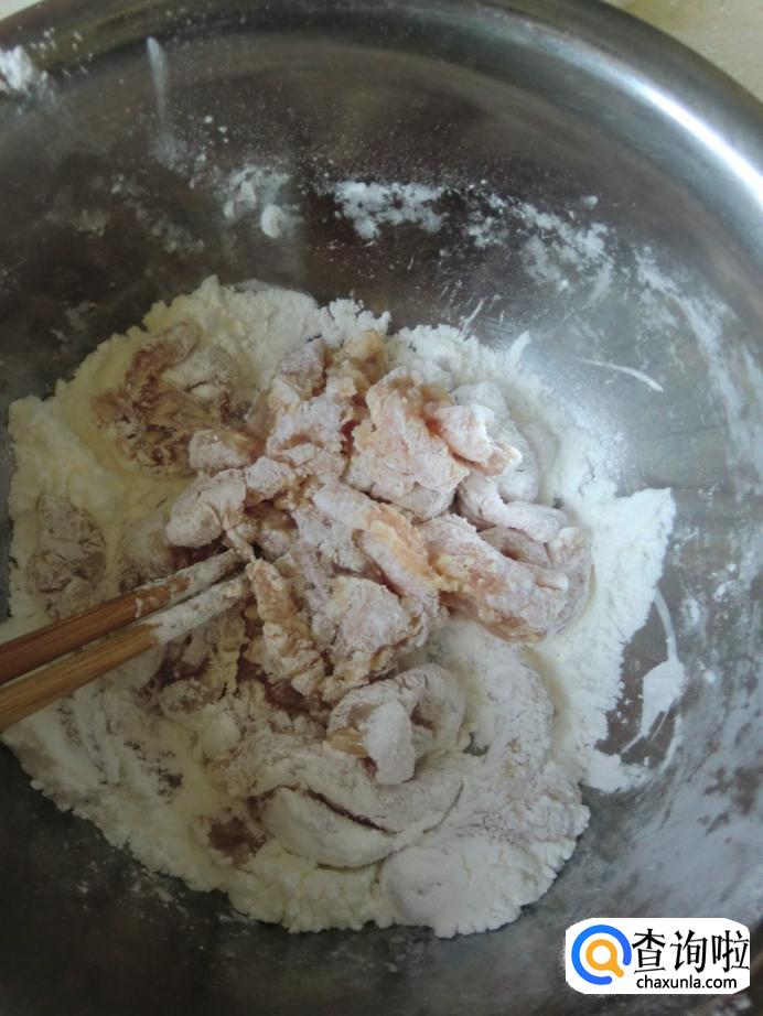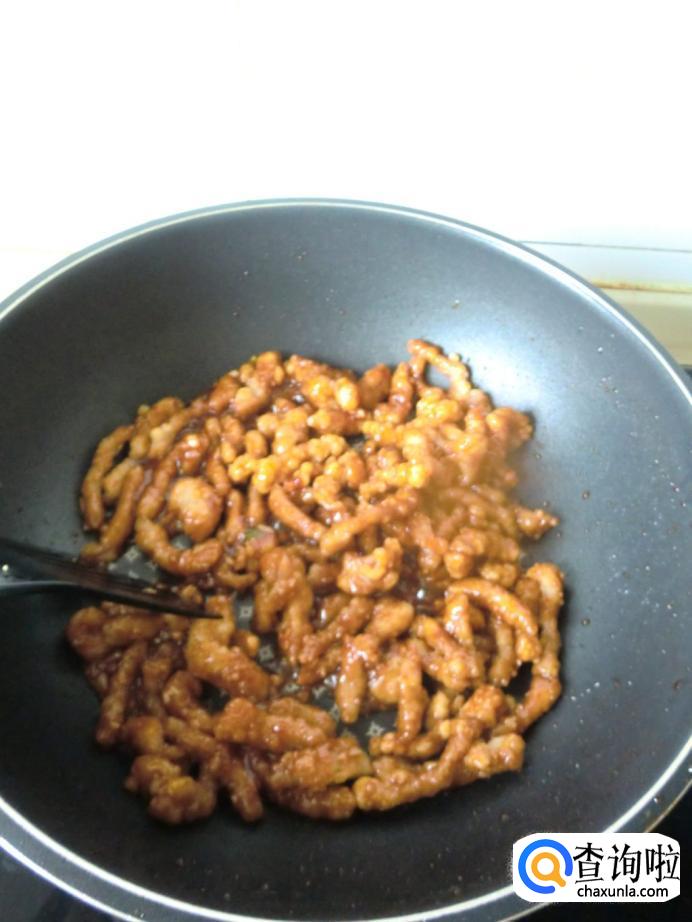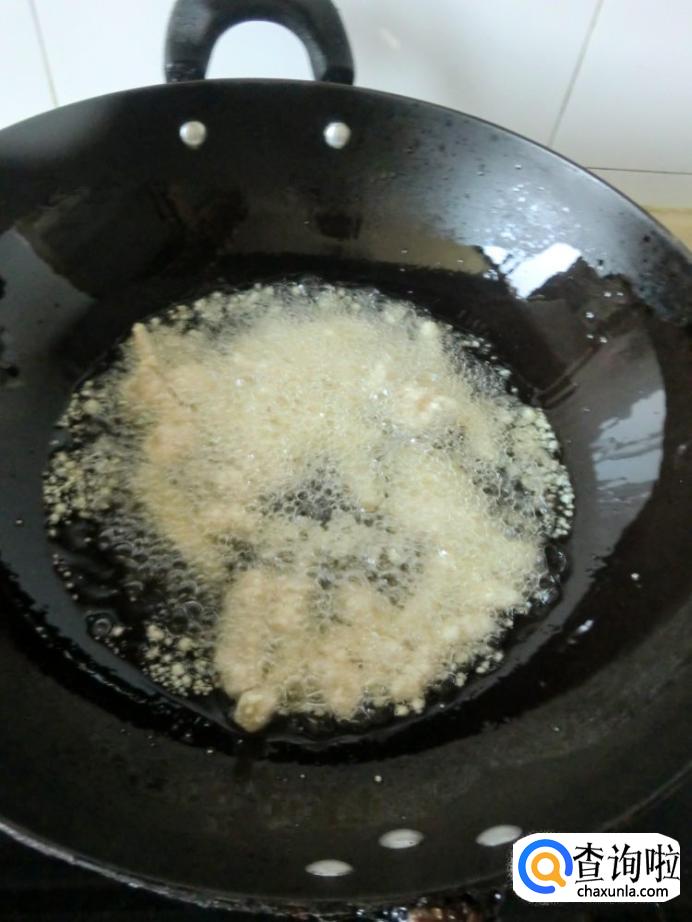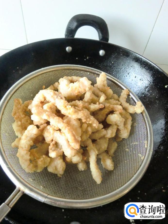 起锅烧油,油温七成熟的时候把裹好干淀粉的肉条放进去炸,肉条炸至金黄的时候捞出备用。