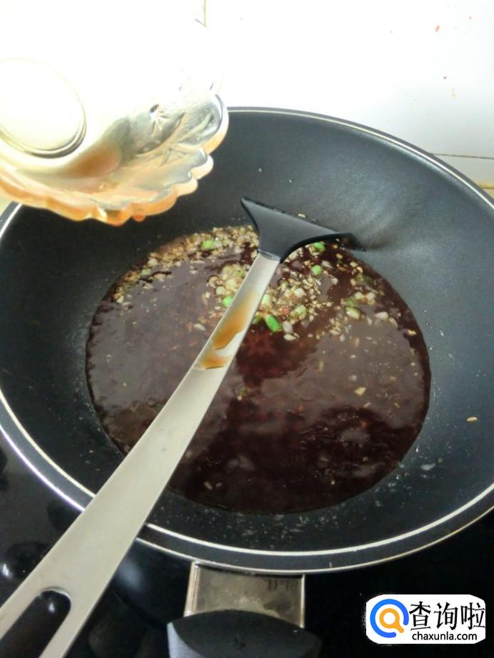 在锅里倒少许油,放入葱姜蒜爆香,然后把调好的酱汁倒入锅中,如下图。