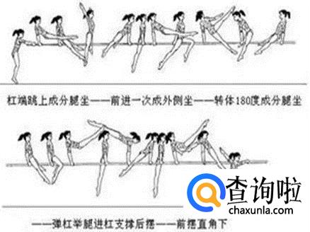 1.直臂撑杠,两腿前摆。2.当腿超过杠面,快速分腿,用腿后部触杠,成分腿坐。3.身体直立髋骑杠,上身前倾,两臂侧举。4.双手放于体前稍远,用力撑杠,收腿下滑进杠,然后前摆成分腿坐。