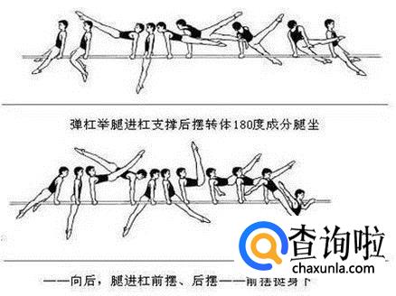 1.身体支撑摆动,当腿部后摆高于杠面,含胸顶肩,身体前倾。2.用腿带动髋骨,转体180°,然后分腿,两手依次推杠换握在体后成分腿坐。注意重复练习。