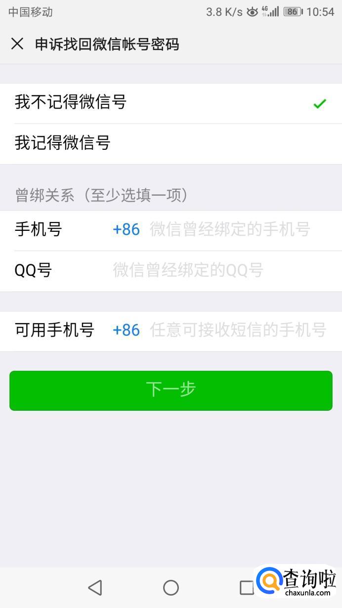 勾选“我不记得微信号”,然后填写之前绑定的手机号和QQ号,也可用其他手机号接受短信,点击“下一步”。