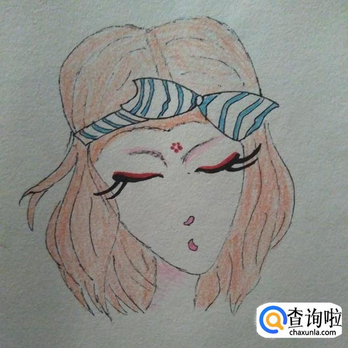 在蝴蝶结下方,靠近脸部边缘处,按如下图所示的笔法,画出紧闭的双眼,并且用签字笔将其涂的浓一些