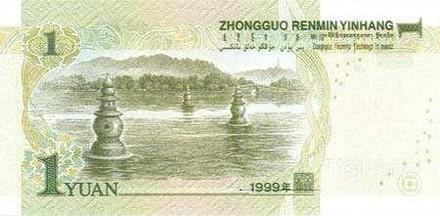 1元人民币纸币背面景观是:西湖三潭印月(浙江杭州)。
