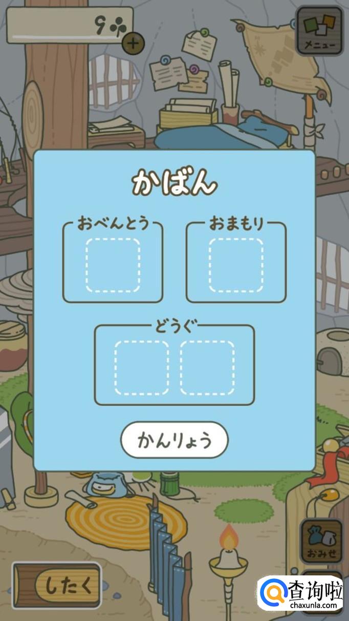 然后再回到房间里,点击左下角的包裹,放入食物和幸运物。然后蛙就会自己出门了。