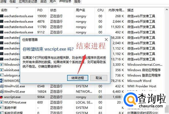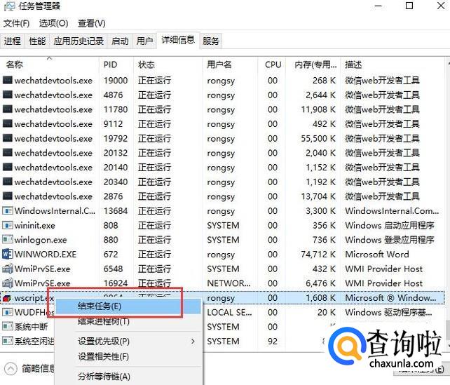 接下来我们选中wscript.exe进程,然后右键单击选择结束任务,如下图所示