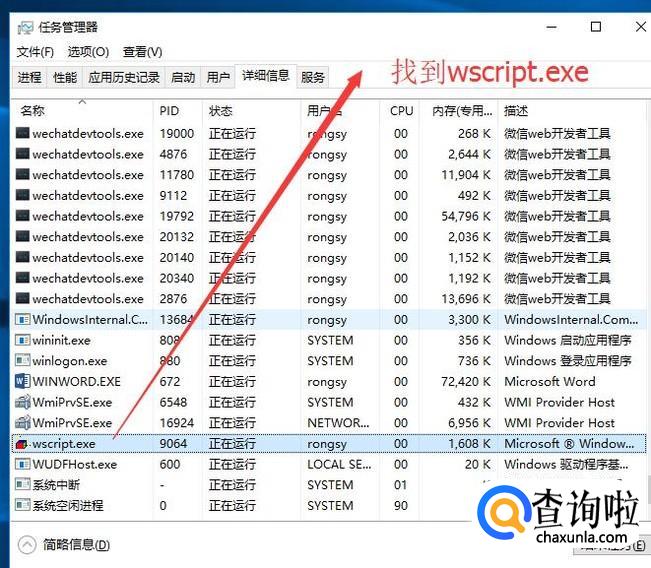 然后我们按CTRL+SHIFT+ESC组合键打开任务管理器,如下图所示,找到wscript.exe进程