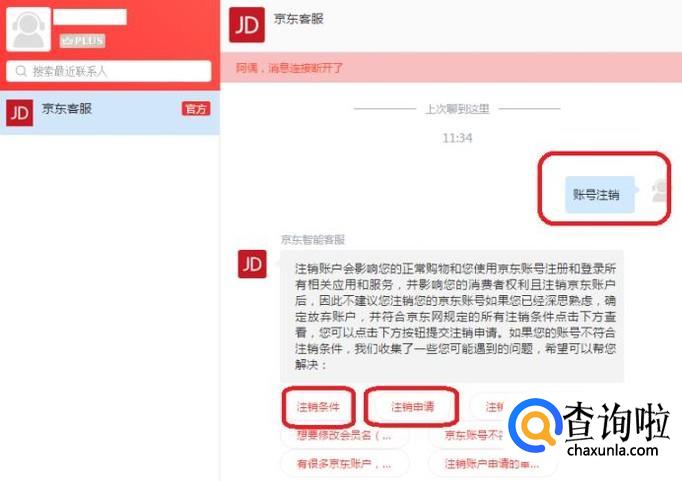 出现与在线客服的对话框,我们输入“注销账号”,智能客服就会给解决方法的链接,如图所示,我们点击“注销申请”即可(注销之前,最好先看一下注销条件)。