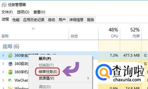 最后就是要关闭一些后台应用程序了,所有运行的程序都会占用电脑的内存,所以那些暂时不用的程序完全可以关闭掉?如何关闭?右键点击电脑任务栏然后打开任务管理器,然后选择不需要的应用将其“结束任务”即可,见下图;