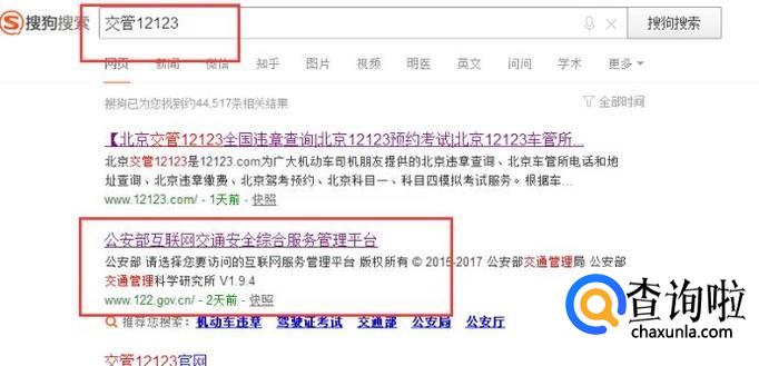 在浏览器地址栏中输入【交管12123】,选择【公安部互联网交通安全综合服务管理平台】,如下图所示: