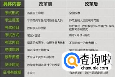 教师资格证考试改革时间从2015年考试正式实施。改革后将实行国考,考试内容增加、难度加大。在校专科大二、大三,本科大三、大四才能报考。改革后将不再分师范生和非师范生的区别,想要做教师都必须参加国考,方可申请教师资格证。