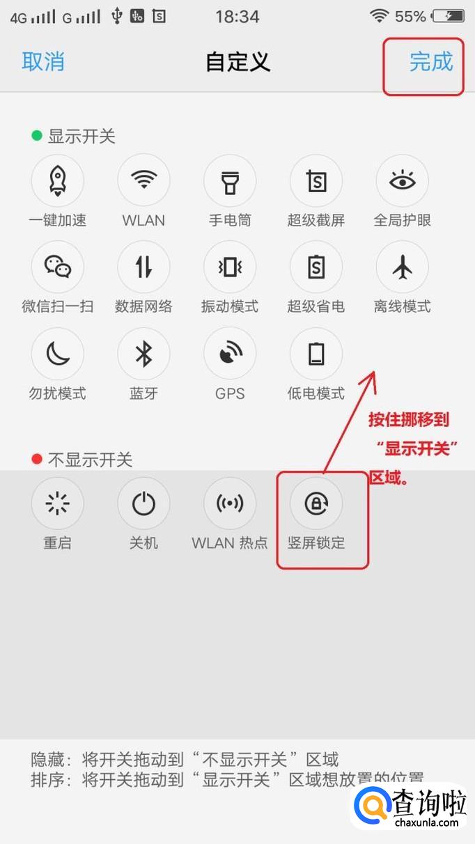 在“不显示开关”里面,把“竖屏显示”按钮按住挪移到“显示开关”,点击左上角“完成”。