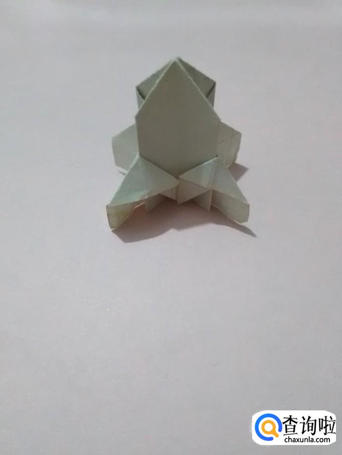 把下面的四个角打开,立在桌上,一个小火箭就折完了。