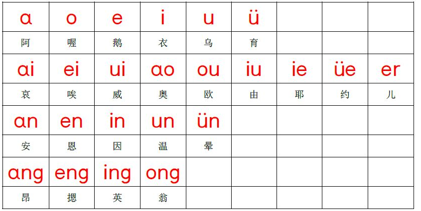 4、前鼻韵母(5个):an安、en恩、in因、un温、ün晕;