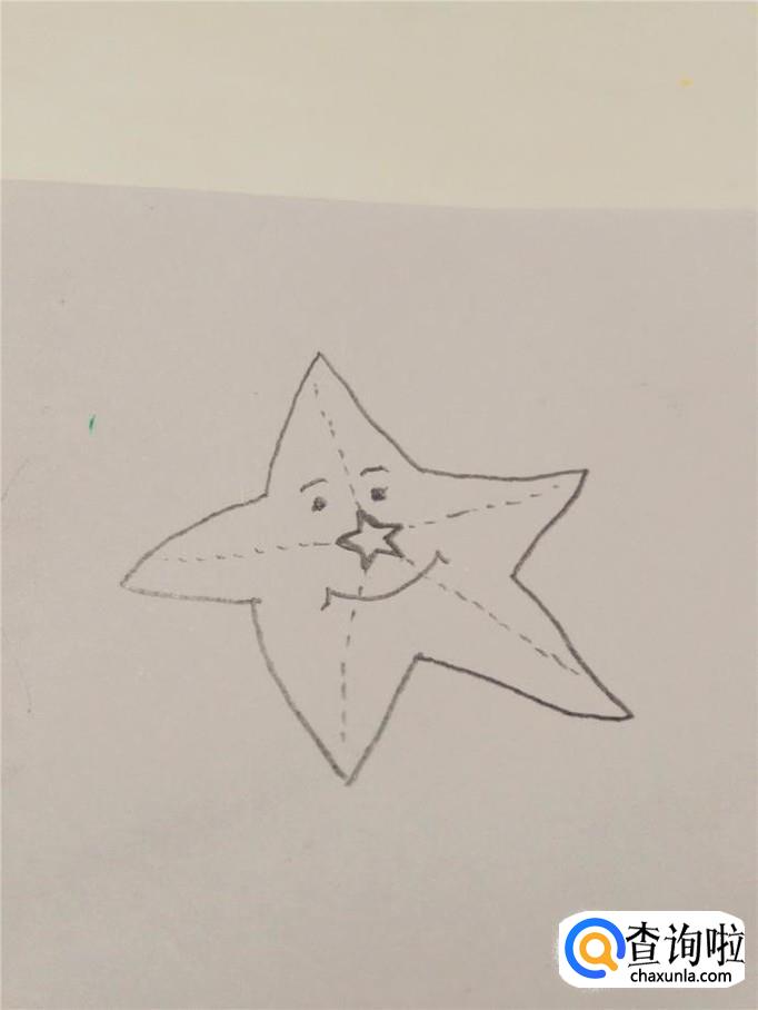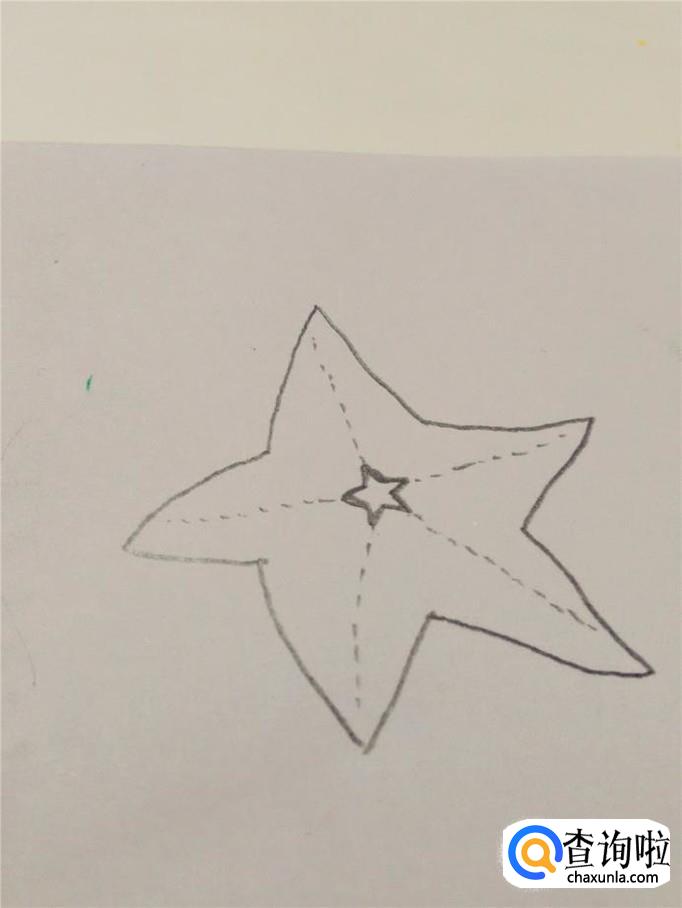 从每条虚线的末端往中间画出一个角,每个角不要求画得平直,稍微有些弯曲,更像海星,把五个角连接好,就成了一个海星的轮廓。