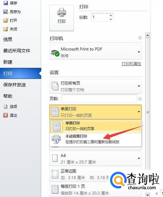 单击后可以发现,打印的默认设置选择的是单面打印。单击单面打印,选择手动双面打印(当然有的软件也可以选择直接双面打印),再单击打印就可以将两页word文档的内容打印再一张纸上了。