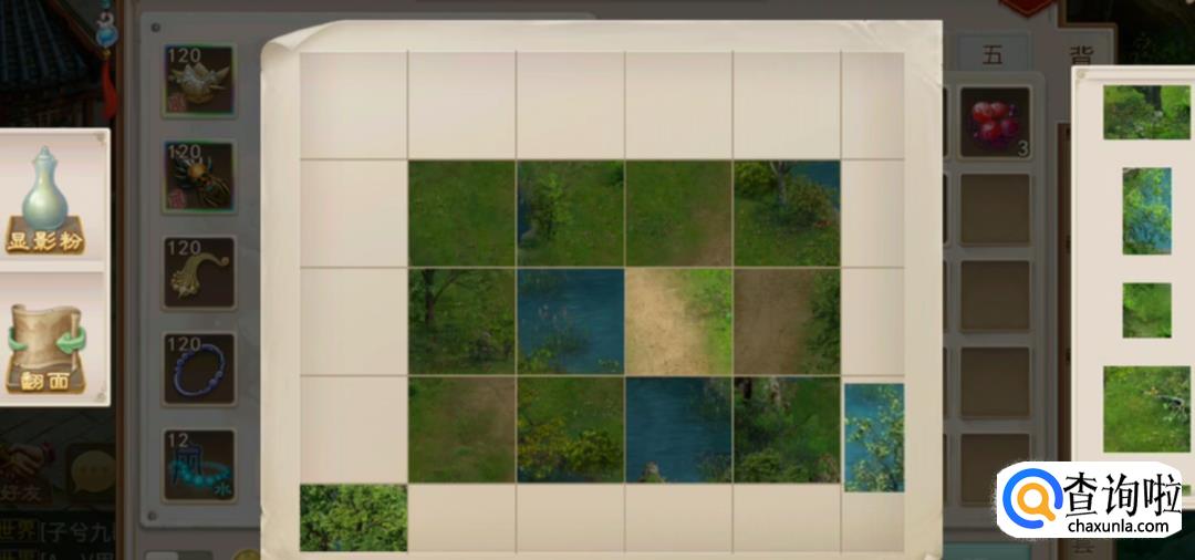 拼图完毕后,撒上“显影粉”后可看到地图上多了一个绿点是NPC的位置。翻面后,能看到模糊字迹。翻面也撒显影粉后提示前往五龙山。