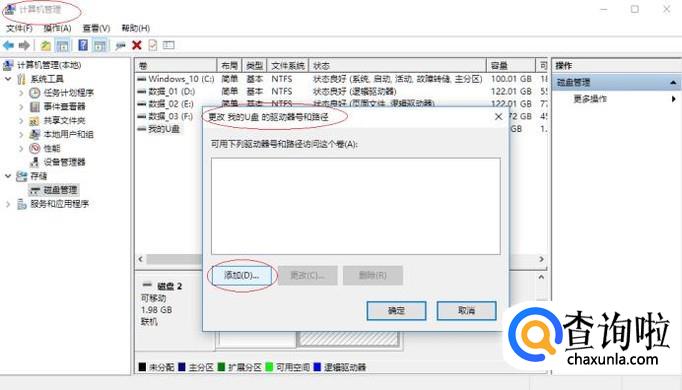弹出"更改驱动器号和路径"对话框,如图所示。点击文本框下侧"添加"按钮,下步将进行排除电脑不显示插入U盘故障的操作。