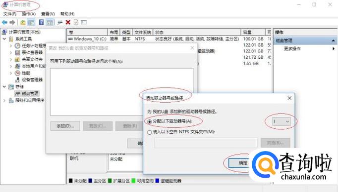 如图所示,弹出"添加驱动器号或路径"对话框。点击"分配以下驱动器号"文本框右侧下拉箭头,为"我的U盘"添加新的驱动器号。