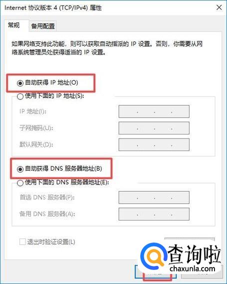弹出的界面,我们将IP地址和DNS地址全部设置成自动获取的形式,之后我们点击确定,我们就可以看到感叹号没有了。