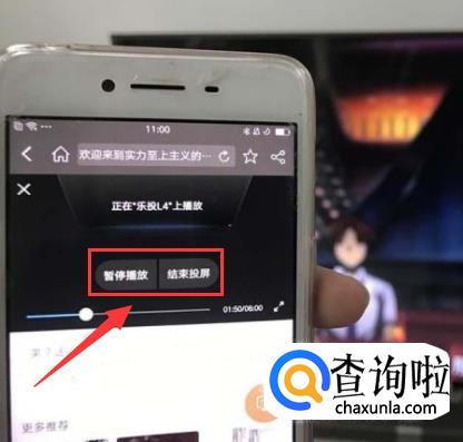 投屏成功后,电视机上就开始播放视频,手机端播放页面会变成黑屏,在黑屏上有两个按键,一个是【退出投屏】,另外一个是【暂停投屏】,如果观看结束了就可以直接点击【退出投屏】即可。