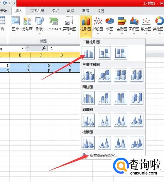 单击左键,下拉菜单的第一个就是簇状柱形图。如果不是,可以在最下面【所有图表类型】中找到
