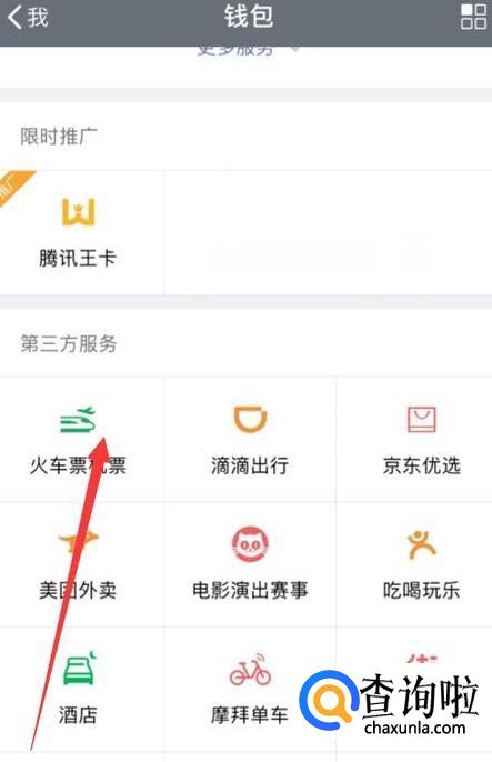 首先在自己的微信的钱包里面找到火车票还有机票预订,然后点击进入,如下图