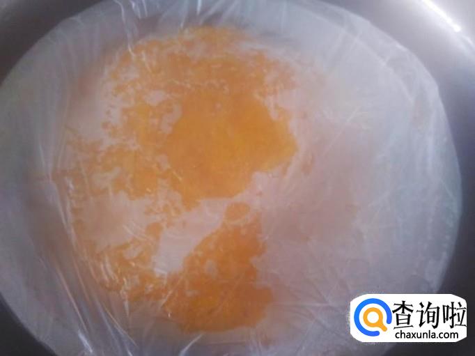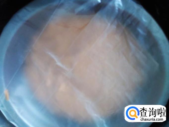 盘子用烤纸垫底,然后把发酵好的粉糊倒进去用薄膜盖住。