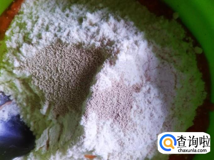 然后加入100克的面粉,酵母【按说明下料】白糖适量搅拌均匀。