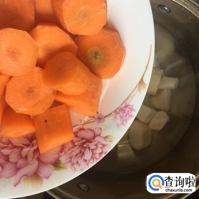 接着把胡萝卜去皮切成段,倒入锅中煮20分钟。