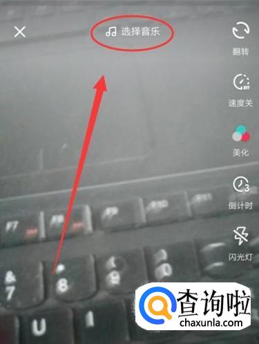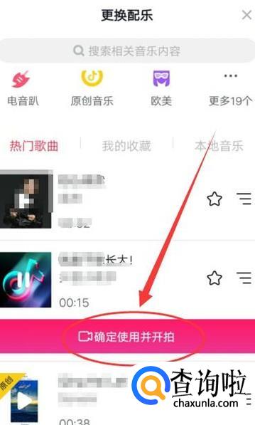 点击图示位置的“选择音乐”,然后进入下一界面选择喜爱的音乐,点击音乐下方“确定使用并开拍”,如图所示。