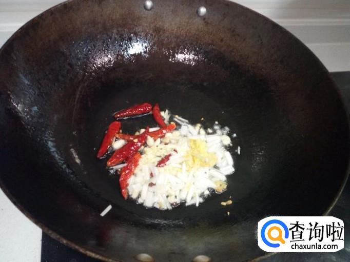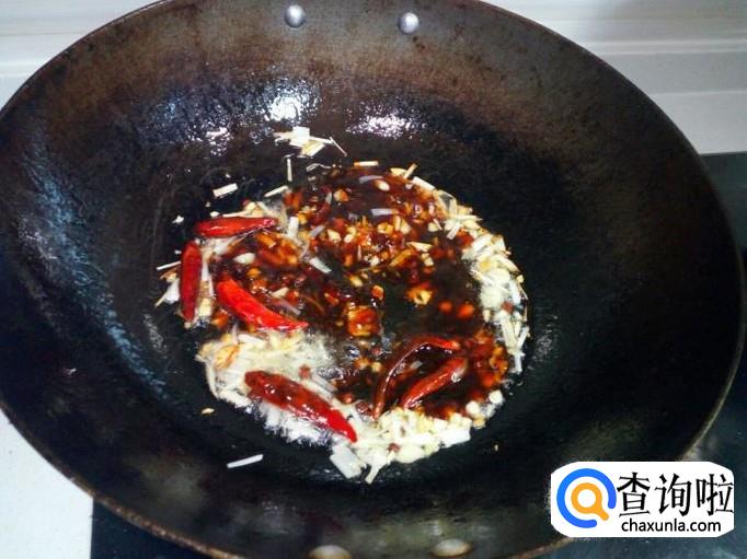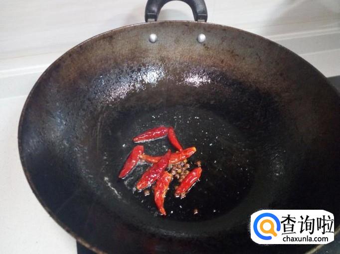 锅内放入油加热,油三,四成热时,放入花椒,红干椒爆锅。