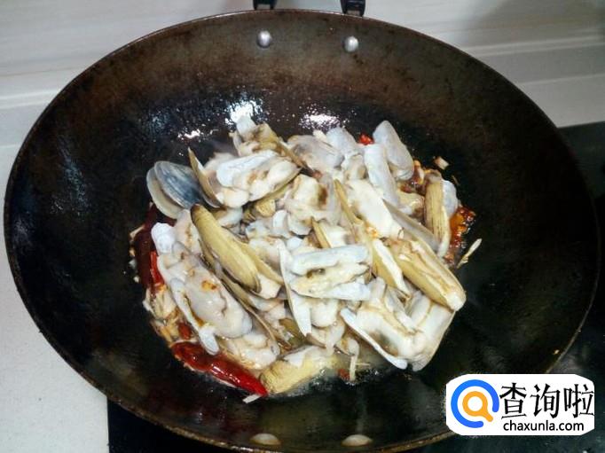 随即放入蛏子大火爆炒,放入白糖,盐。