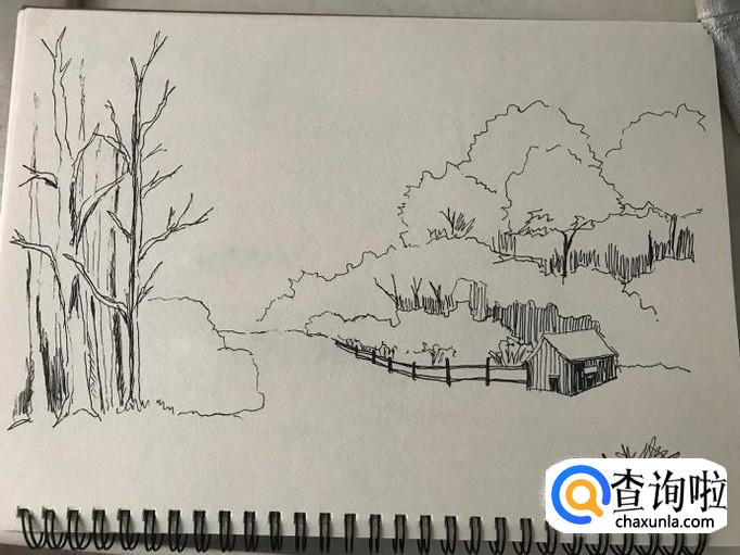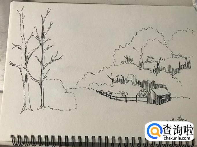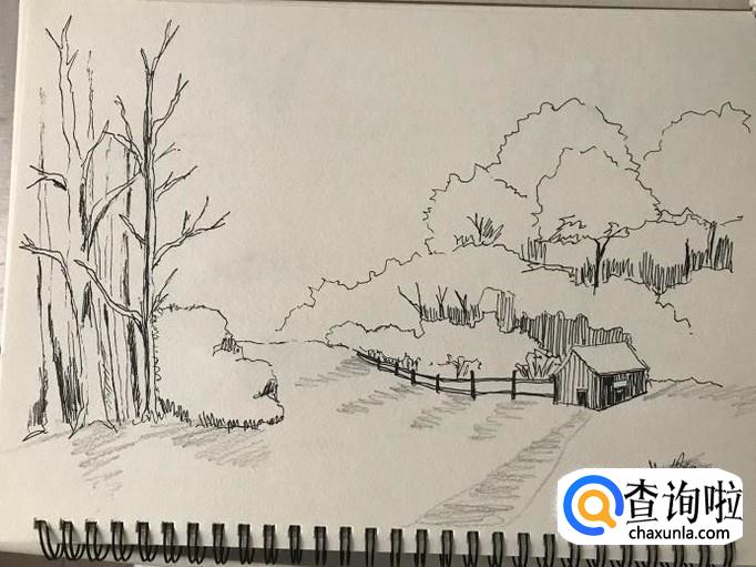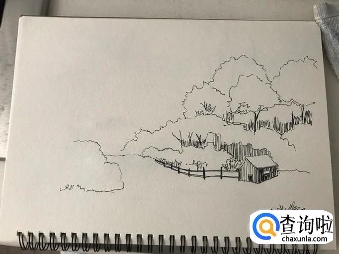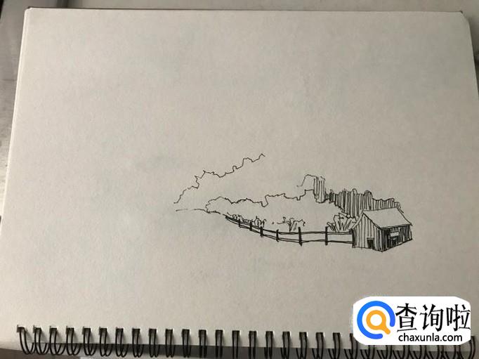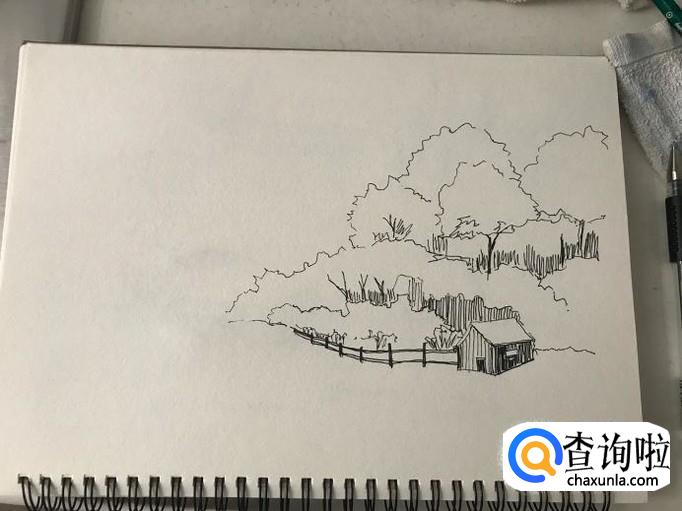 接下来我们要绘制小房子后面的灌木,这里要绘制深色的灌木,用斜线体现远景的景深。远处的灌木只要绘制出轮廓线就行。