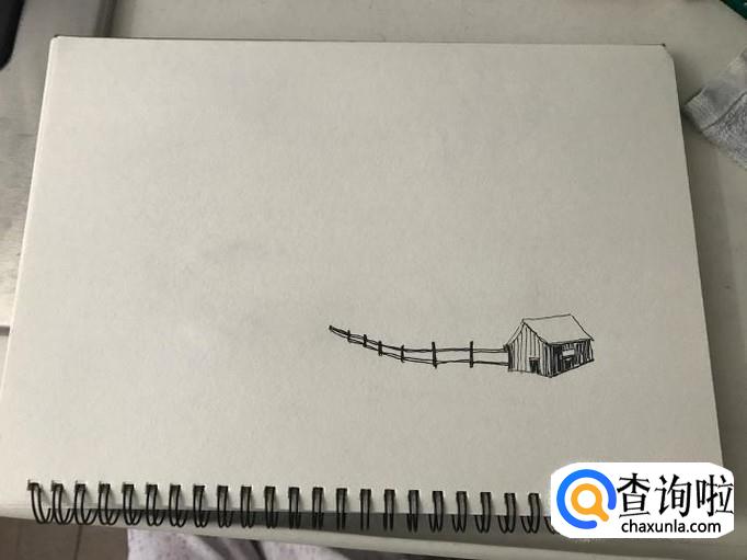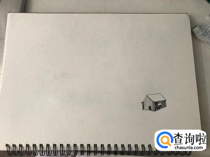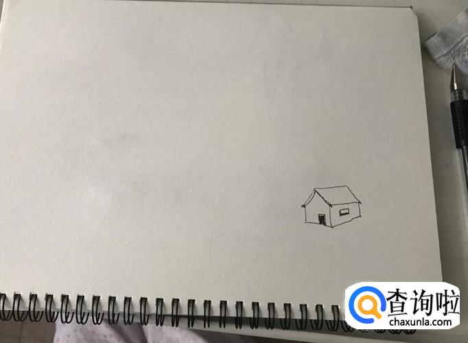 首先我们在速写本的右下方绘制一栋小房子,小房子的大小为两厘米到三厘米之间。绘制顺序为:屋顶、墙面、门、窗。