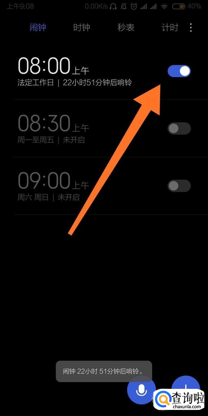 然后查看闹钟是否开启,闹钟时间是否正确。