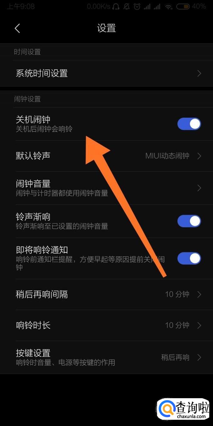 接下来打开“关机闹钟”选项,确保手机在关机后也能正常响铃。