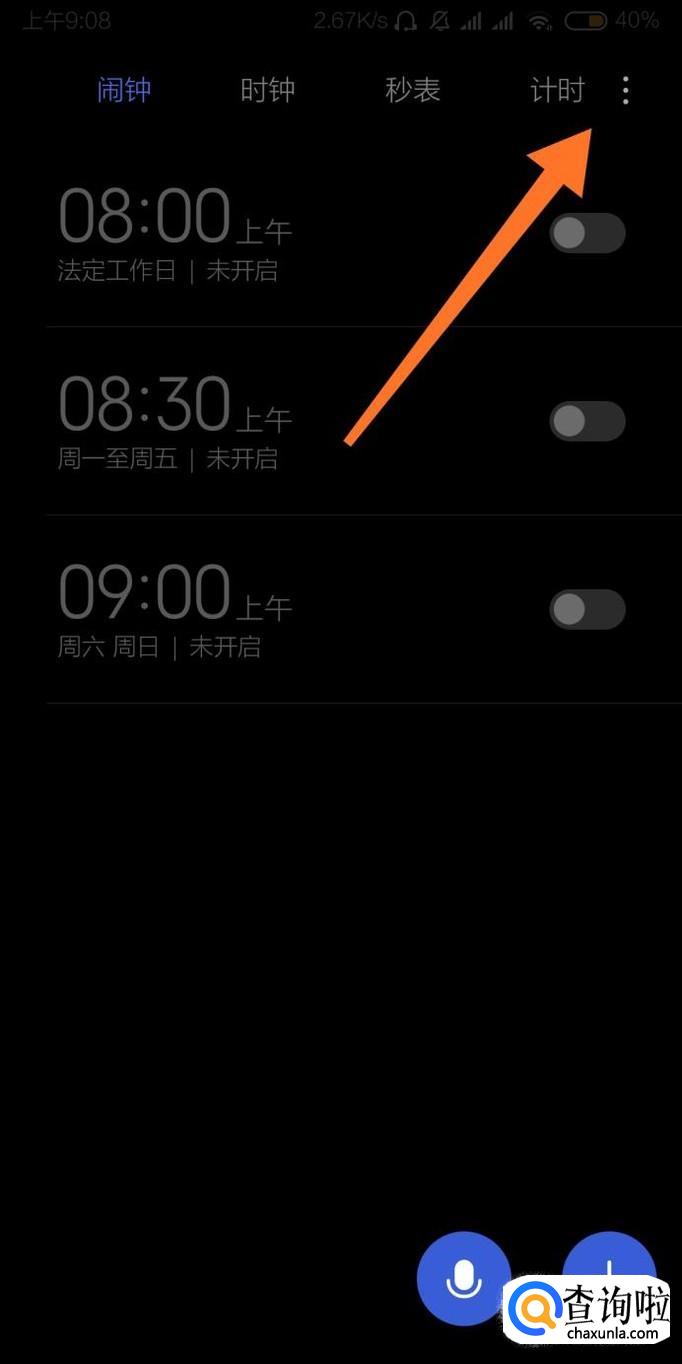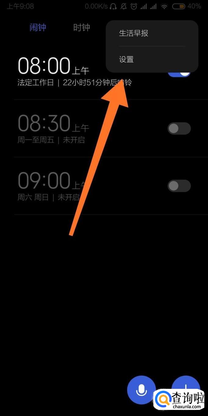 再点击闹钟界面右上角的菜单键,点击进入“设置”。