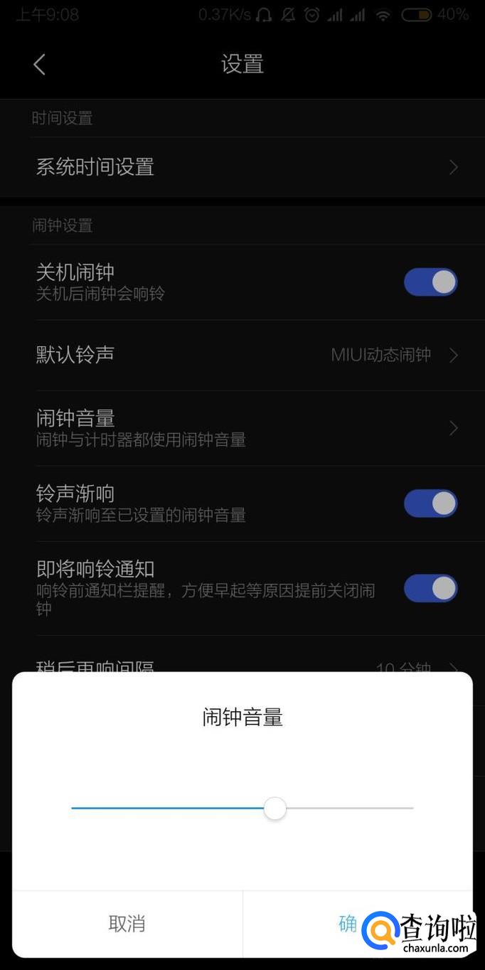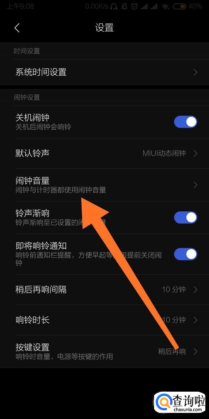 最后点击进入“闹钟音量”设置选项,确保闹钟音量不是很小。经过上面一番设置后,就能确保小米手机闹钟响铃正常了。