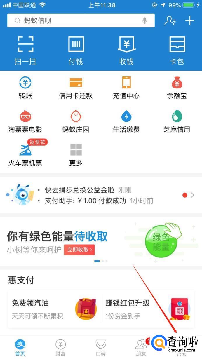 或者在刚刚进入“支付宝”界面中点击右下角的“我”。