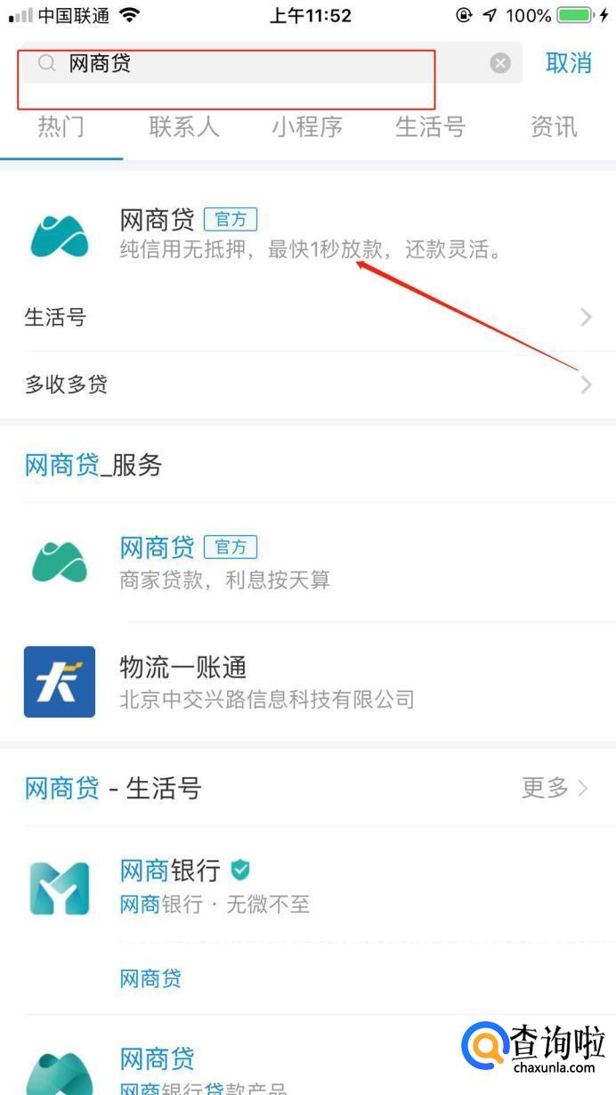 在主页搜索栏里搜索“网商贷”,点击第一个选择进入。