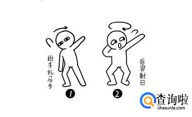 抬手扎马步,一只手放在脑后,一只手平举在前面从左至右晃动,双脚一直晃动。