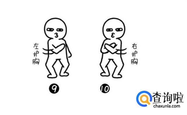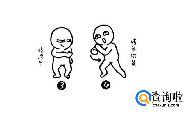 双脚张开,手的动作想一个波浪一样,右手一点一点左手手腕,就像切菜一样。