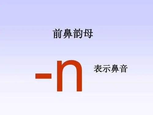 前鼻音尾韵母的发音中,韵头的发音比较轻短,韵腹的发音清晰响亮,韵尾的发音只做出发音状态。含有前鼻韵母的字有安、俺、岸、嗯、门、嫩、岑、因、新、您、敏、群、问、润、吞、损。