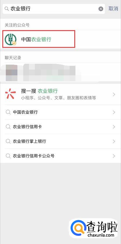 然后搜索你的银行卡所属的银行名字。这里以中国农业银行为例。关注中国农业银行的微信公众号。