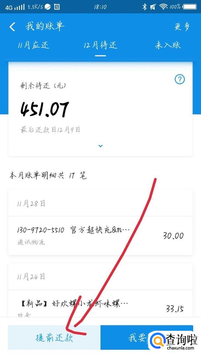 点击“我的账单”选项,如图1箭头所示。你会看到出现一个新的界面,点击“还款”选项,如图2箭头所示。直接还款就可以了。